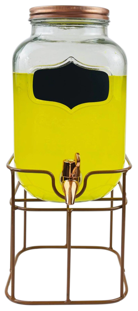 Con tapa a rosca hermética con base metálica y canilla plástica antigoteo con terminación color cobre. Ideal para elaborar jugos detox con frutas naturales o mantener agua filtrada y refrigerada con hielos.